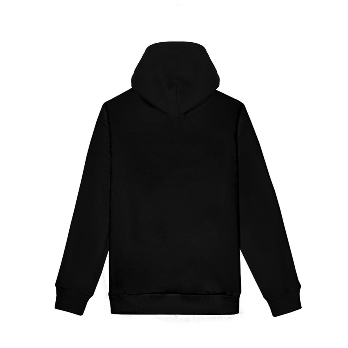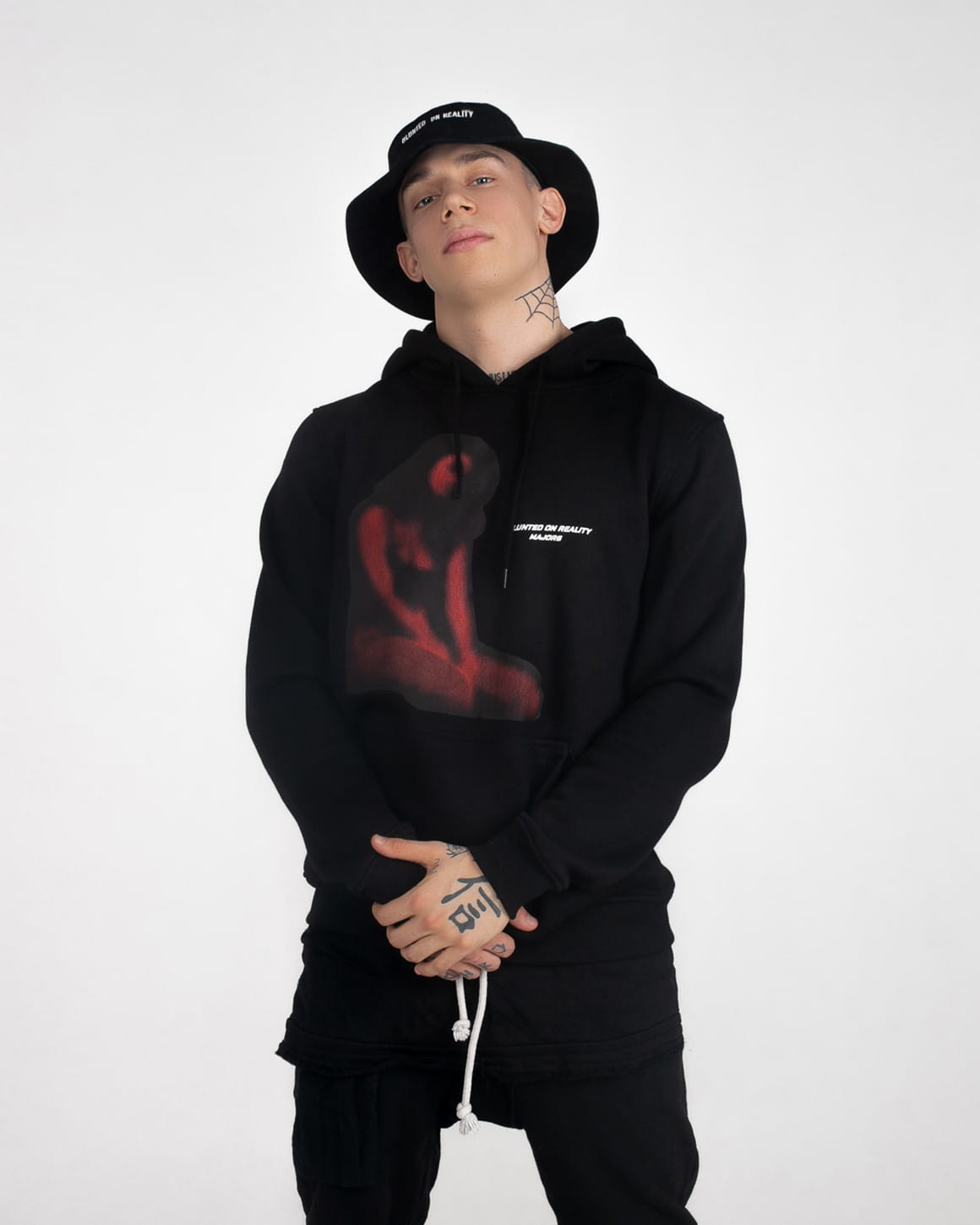 Męska czarna bluza z kapturem oraz dużym nadrukiem z przodu.