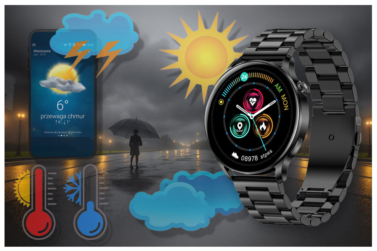 Smartwatch po podłączeniu z aplikacją wyświetla dane o pogodzie. Teraz wystarczy jedno spojrzenia na smartwatcha i już wiesz jaka pogoda będzie Ci towarzyszyć w najbliższym czasie. Dzięki pogodzie w smartwatchu możesz lepiej zaplanować swoją aktywność i ubrać się odpowiednio do otaczającej aury!