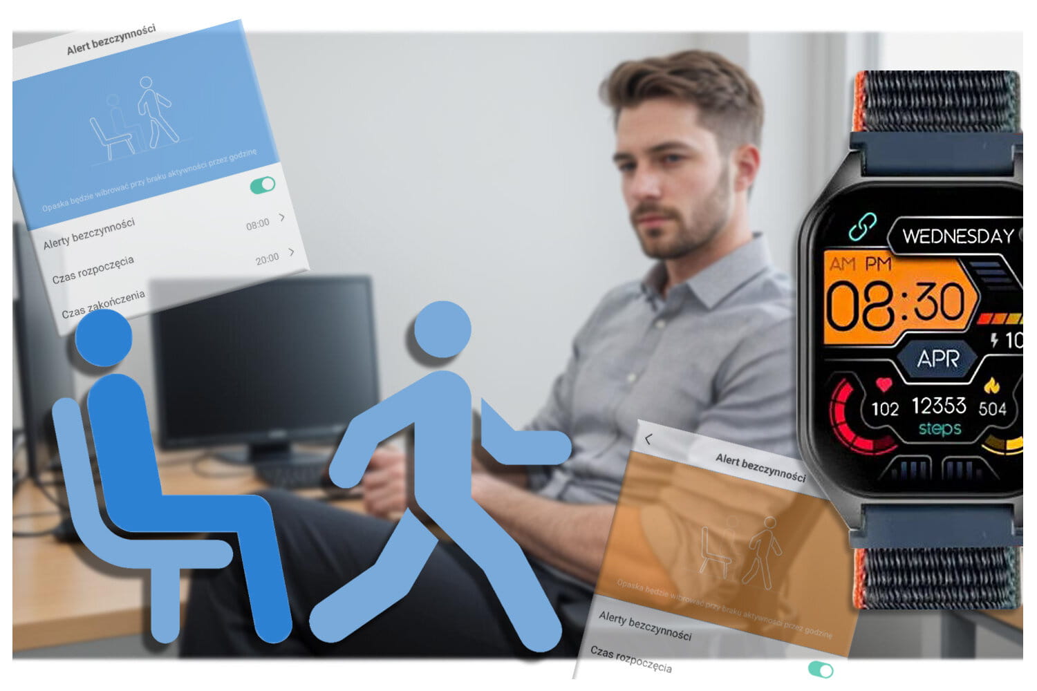 - przypomnienie o wypiciu wody, ruchu