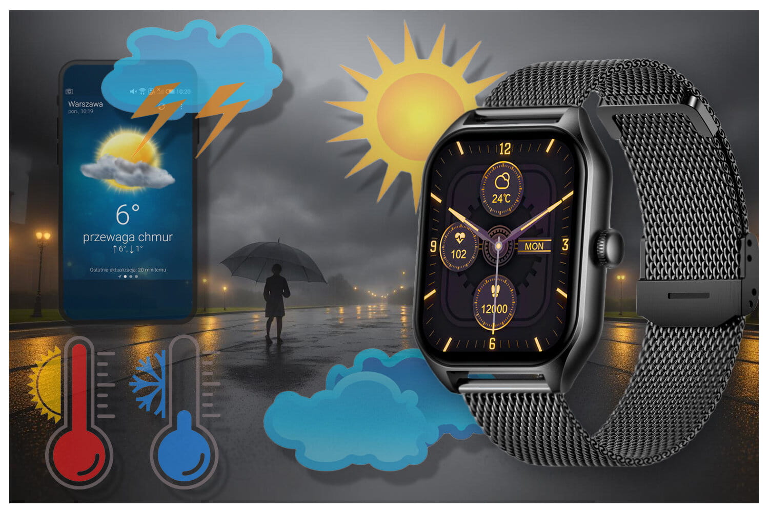 Smartwatch po podłączeniu z aplikacją wyświetla dane o pogodzie. Teraz wystarczy jedno spojrzenia na smartwatcha i już wiesz jaka pogoda będzie Ci towarzyszyć w najbliższym czasie. Dzięki pogodzie w smartwatchu możesz lepiej zaplanować swoją aktywność i ubrać się odpowiednio do otaczającej aury!