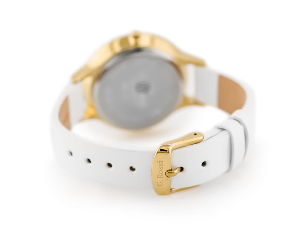 Zegarek damski G. ROSSI 10411A-3C2 to elegancka propozycja na co dzień, która łączy subtelną kobiecość z wyjątkowym stylem. Z białym paskiem ze skóry, kopertą w złotym odcieniu i białą tarczą, prezentuje się bardzo szykownie. Indeksy na tarczy to delikatne kryształki, które dodają mu blasku i finezji. Zegarek posiada wodoodporność na poziomie WR30, co zapewnia komfort użytkowania w codziennych sytuacjach. Idealny wybór dla kobiet ceniących elegancję, ale szukających także praktyczności w swoich dodatkach.
