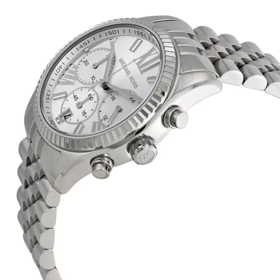 Model Michael Kors MK5555 z serii Lexington to stylowy damski zegarek o niebanalnej stylistyce, doskonały do eleganckiego ubioru. Zegarek w kolorze srebrnym idealnie pasuje do wielu kreacji. Wyposażony jest w precyzyjny mechanizm kwarcowy, dzięki któremu zegarek dokładanie pokazuje aktualną godzinę. Na tarczy zabezpieczonek mineralnym szkłem znajdziemy datownik wskazujący dzień miesiąca oraz 3 subtarcze będące wskazaniami chronografu oraz czasu dobowego.