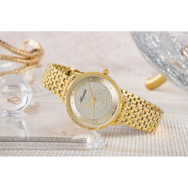 Adriatica A3751.1141Q to zegarek przyciągający spojrzenia blaskiem dyskretnego luksusu. Tarcza tego modelu urzeka wyjątkową strukturą – centralna część pokryta jest połyskującą fakturą przypominającą diamentowy pył, otuloną satynowanym pierścieniem o łagodnym, złotym wykończeniu. Drobne, punktowe indeksy oraz pojedynczy kryształek na godzinie 12 dodają kompozycji biżuteryjnego charakteru. W sercu tego modelu pracuje szwajcarski mechanizm kwarcowy, gwarantujący niezawodność i precyzję Swiss Made - wartości, które od dekad stanowią synonim najwyższej jakości. Bransoleta, zbudowana z elegancko zaokrąglonych, lśniących ogniw, układa się na nadgarstku z lekkością i gracją. To zegarek, który możesz nosić codziennie - a który za każdym razem będzie wyglądał jak wyjątkowy akcent biżuterii.