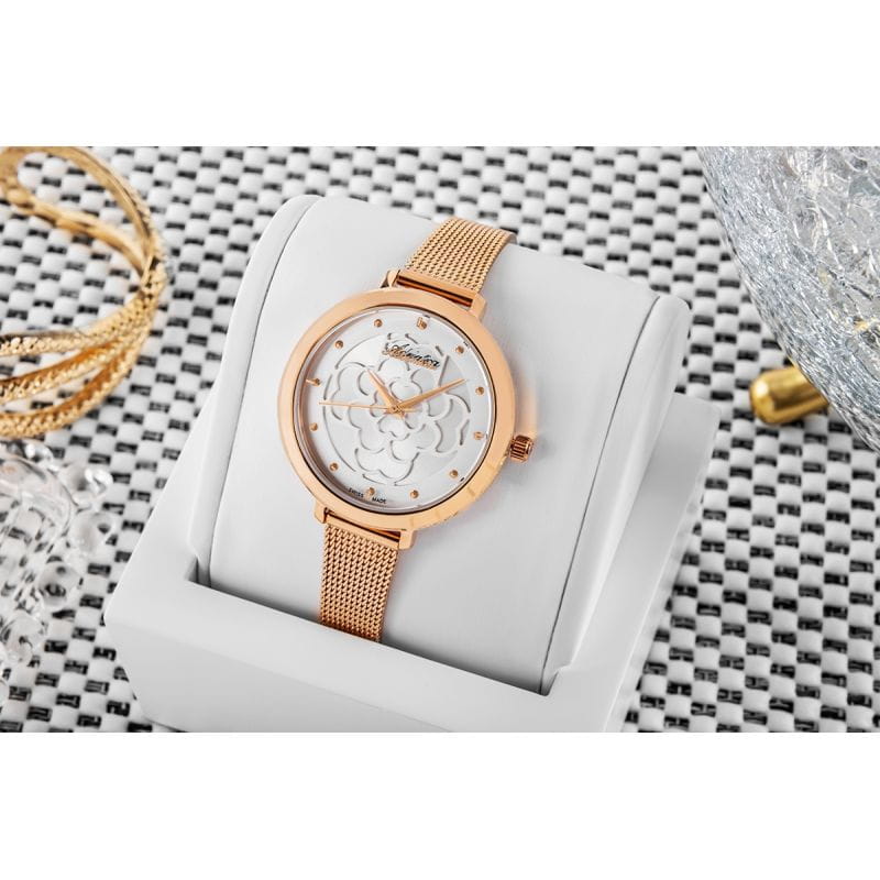 Zegarek zachwyca tarczą niczym artystycznie wykuty kwiat, subtelnie zaklęty w chłodnym połysku metalu. Głęboko frezowany wzór tworzy efekt przestrzenności, który dodaje całości nie tylko elegancji, lecz także intrygującej głębi – jakby każdy promień światła odkrywał nową warstwę detalu. Szczególną uwagę przyciąga podwójne logo Adriatica – jedno harmonijnie wpisane w strukturę tarczy, drugie ledwie dostrzegalne, unosi się na powierzchni szkiełka. Ten finezyjny zabieg wprowadza lekkość, grę światła i iluzję wielowymiarowości – sprawiając, że tarcza żyje w rytmie chwili.