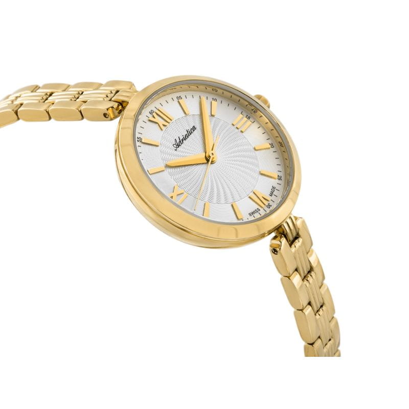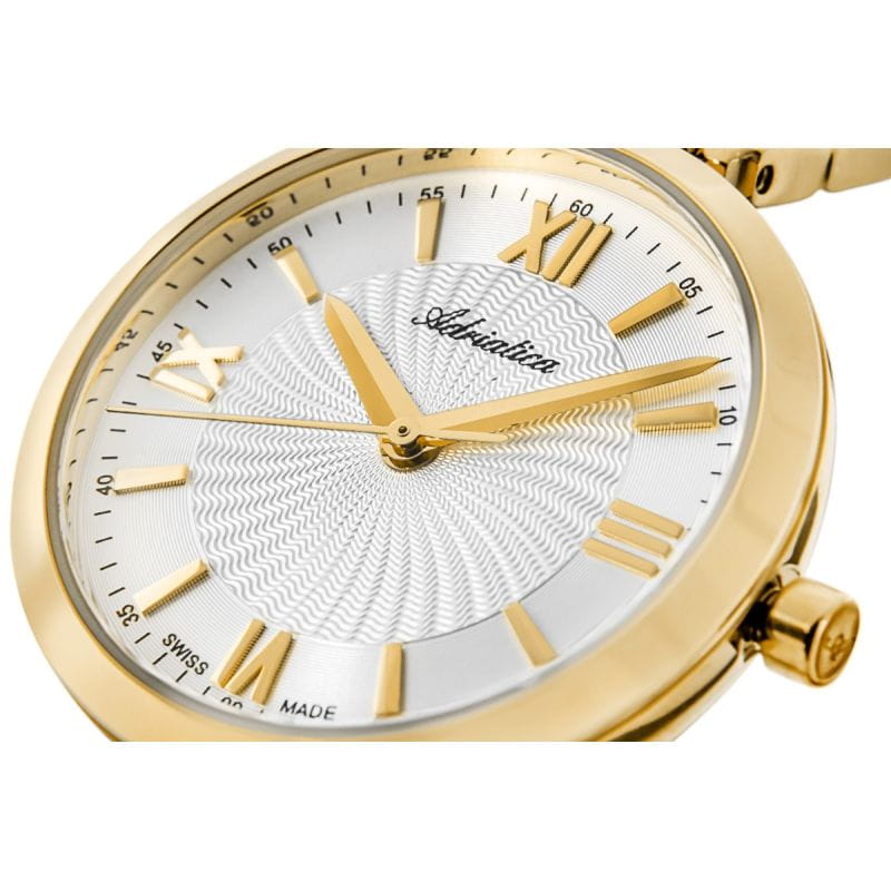 Precyzyjne wskazówki, złote rzymskie indeksy i tarcza, która miękko odbija światło – wszystko razem tworzy kompozycję, od której trudno oderwać wzrok. Wysokiej jakości materiały, dopracowane z zegarmistrzowską precyzją detale i perfekcyjnie skomponowana kolorystyka – zegarek Adriatica nosi się jak biżuterię, a każdy rzut oka na nadgarstek staje się estetycznym przeżyciem. Całość dopełniają: nazwa Adriatica na tarczy, i dyskretne logo na zapięciu bransolety oraz na koronce zegarka.