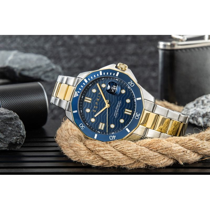 Jeśli podoba Ci się design premium zegarków, ale nie chcesz wydawać znacznej kwoty, ESPRIT oferuje solidny model w stylu luksusowych diverów, łączący sportowy charakter i elegancję. Jego masywna, stalowa koperta i wyrazisty, ośmiokątny bezel w granatowym kolorze z wyraźnymi oznaczeniami minutowymi od razu przywodzą na myśl luksusowe modele zegarków sportowych premium. Tarcza z falistym wzorem inspirowana żeglarskim światem, złoto-stalowa bransoleta (bicolor) oraz okrągłe, złote indeksy i wyraźne wskazówki wypełnione masą fluorescencyjną nawiązują do stylu najbardziej rozpoznawalnych zegarków na świecie. To świetny wybór dla mężczyzny, który ceni klasykę, ale jednocześnie chce wyróżniać się nowoczesnym, prestiżowym dodatkiem.