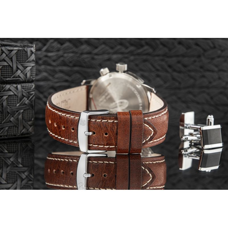 Zegarek został zestawiony z ciemnobrązowym paskiem z naturalnej skóry z jasnymi przeszyciami, co podkreśla jego lotniczy charakter i zapewnia wysoki komfort noszenia. Wodoszczelność na poziomie 5 ATM skutecznie chroni mechanizm przed przypadkowymi zachlapaniami, deszczem czy wilgocią.