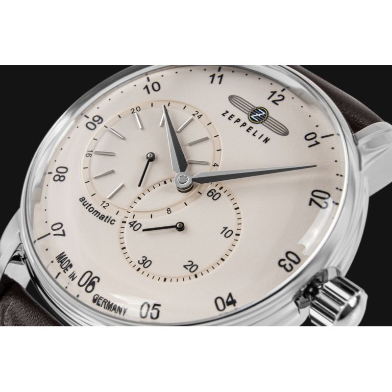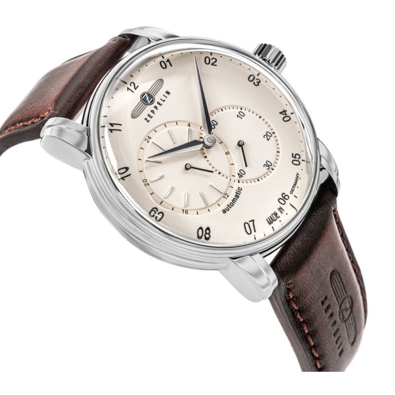 Jego elegancka, srebrna koperta idealnie komponuje się z beżową tarczą, która przykuwa wzrok subtelną głębią koloru, srebrne indeksy i wskazówki czarne z akcentem załamania światłą dodają mu ponadczasowej klasy i zapewniają wyjątkową czytelność. Pasek wykonany z wysokiej jakości skóry w brązowym odcieniu, zszyty brązową nicią, co dodaje mu subtelnego charakteru vintage. Na pasku znajduje się tłoczone logo Zeppelin oraz napis, które podkreślają luksusowy i autentyczny charakter zegarka. Każdy element, od solidnej srebrnej sprzączki po stylową koronkę, został dopracowany, by stworzyć spójną i wyjątkową kompozycję.
