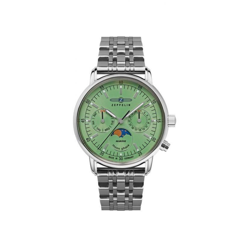 Zegarek Zeppelin LZ 14 Marine 8637M‑4 Quartz z zieloną tarczą łączy elegancki, klasyczny design z inspiracjami marynistycznymi. Koperta ze stali nierdzewnej zapewnia trwałość, a szkło mineralne chroni tarczę przed zarysowaniami. Zielona tarcza z wyraźnymi indeksami, subtelnym datownikiem i eleganckimi wskazówkami nadaje zegarkowi charakterystyczny, marynistyczny wygląd.