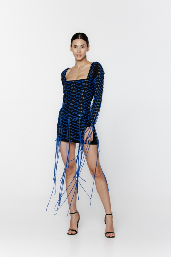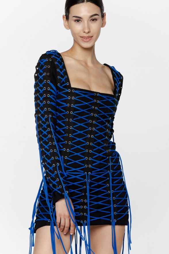 Czarna sukienka z niebieskimi ozdobnymi wiązaniami to elegancka i wyrazista propozycja dla kobiet ceniących oryginalne detale. Dopasowana forma podkreśla sylwetkę, a długi rękaw dodaje jej subtelnej elegancji. Wykonana z elastycznego, miłego w dotyku materiału, sukienka zapewnia komfort noszenia, a jej długość mini dodaje odrobinę zmysłowości. Niebieskie wiązania stanowią wyjątkowy akcent, który przyciąga wzrok i nadaje sukience nowoczesnego charakteru.