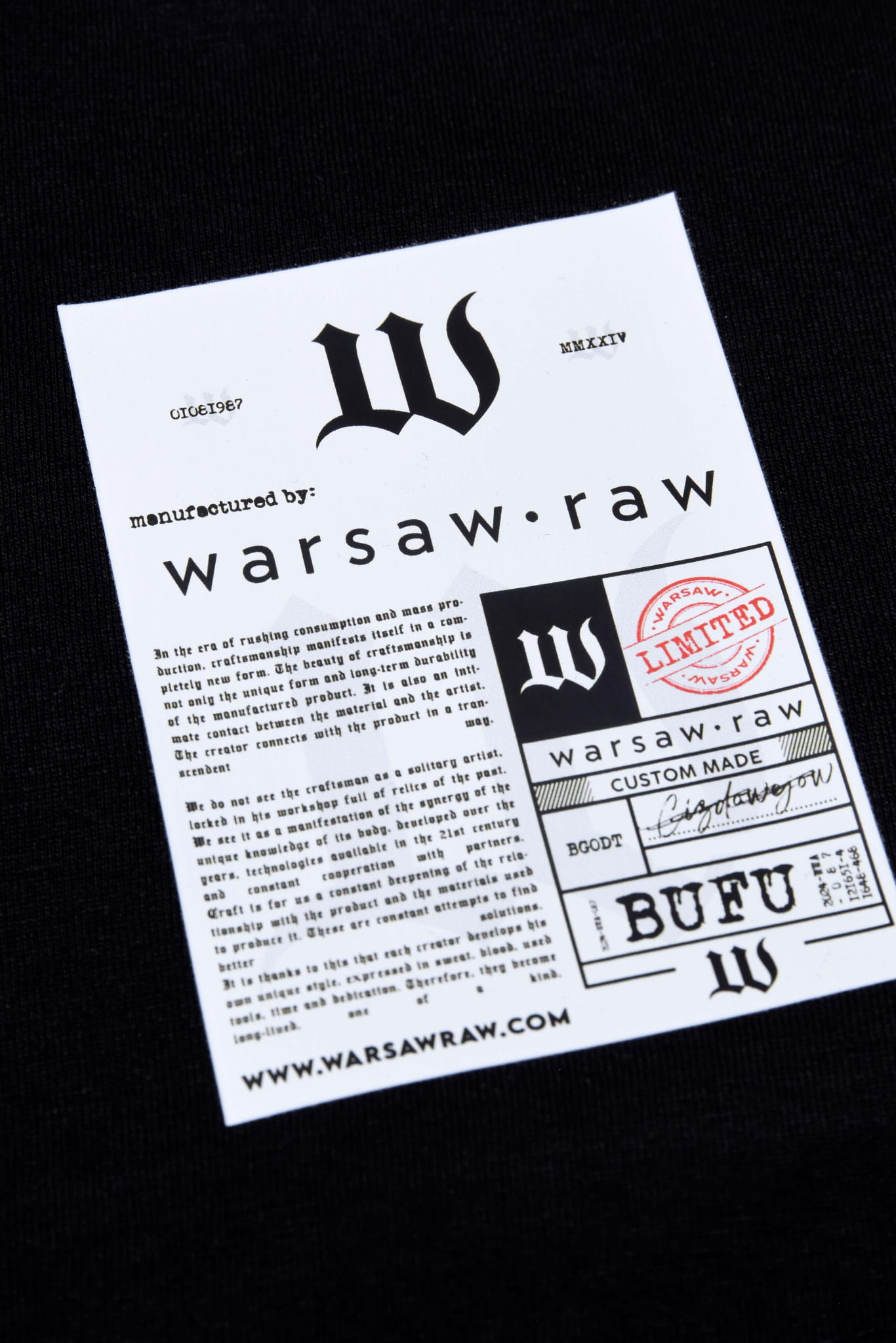 Warsaw Raw to marka modowa stawiająca na zrównoważony rozwój i sztukę użytkową. Specjalizuje się w limitowanych edycjach oryginalnych koszulek, kurtek, akcesoriów i obuwia, które łączą w sobie surowy styl uliczny z ornamentalnym zdobnictwem inspirowanym krawiectwem wysokim.